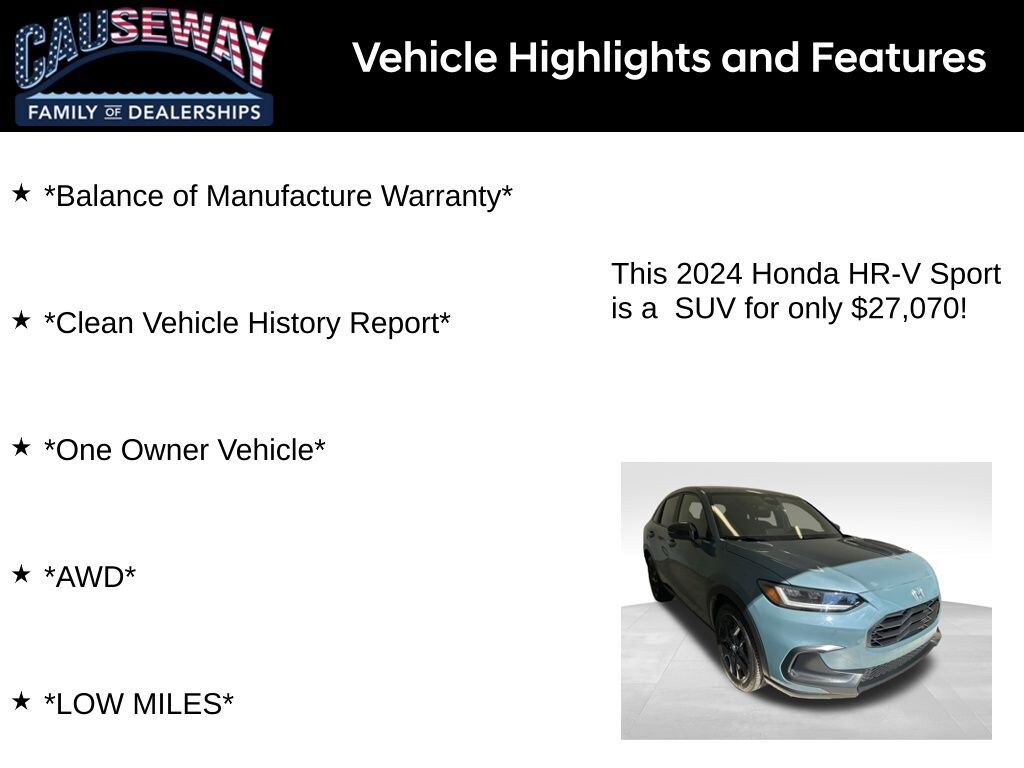 This 2024 Honda HR-V Sport AWD combines modern tech, advanced safety, and sporty style in a versatile package built for both city life and weekend getaways. With its low miles and factory-backed warranty, its the perfect balance of confidence, efficiency, and fun-to-drive capability.