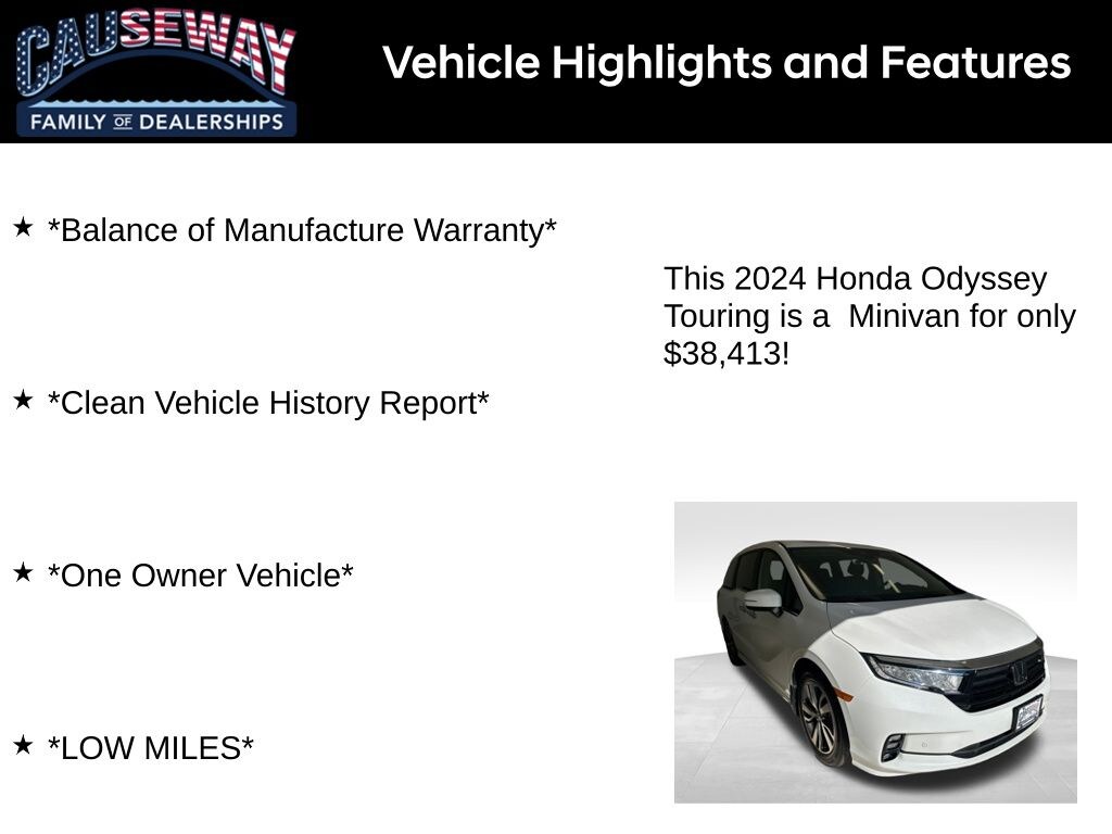 The 2024 Honda Odyssey Touring is the ultimate blend of family practicality, refined style, and premium comfort. With advanced technology, low miles, and manufacturer-backed warranty coverage, its the perfect choice for families who want more than just a minivanthey want a luxury travel experience on wheels.