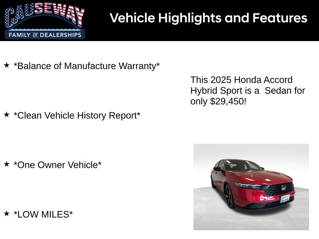2025 Honda Accord Hybrid Sport Radiant Red Metallic FWD eCVT 2.0L I4 DOHC 16V *Balance of Manufacture Warranty*, *Clean Vehicle History Report*, *One Owner Vehicle*, *LOW MILES*, 2.0L I4 DOHC 16V.