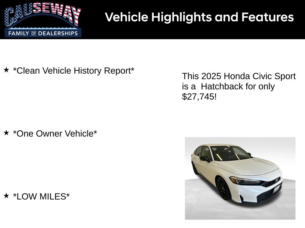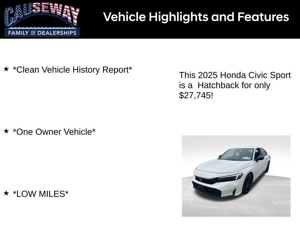 Experience the perfect blend of performance, style, and modern technology with the 2025 Honda Civic Sport, finished in Platinum White Pearl. This one-owner vehicle comes with a clean vehicle history report and low miles, making it a smart choice for buyers who value reliability and efficiency.
