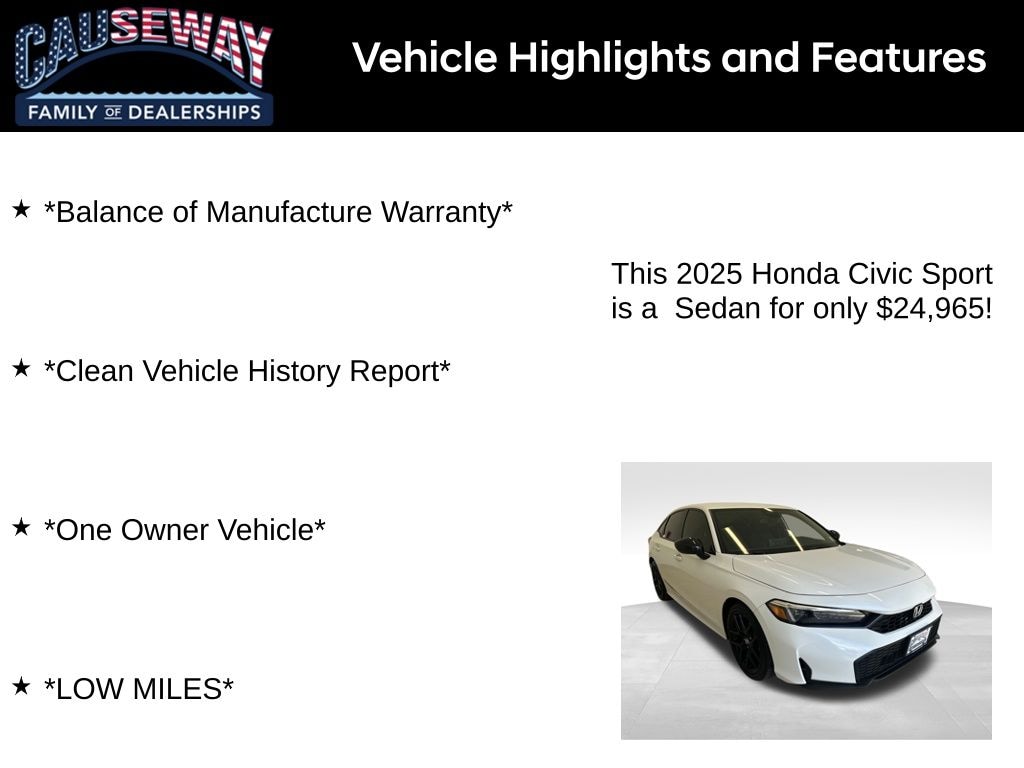 Elevate every drive in this 2025 Honda Civic Sport, finished in Platinum White Pearl with a bold black artificial leather interior. With just 11,582 miles, this one-owner sedan is practically new and backed by the balance of Hondas factory warranty, giving you confidence and value you can count on.