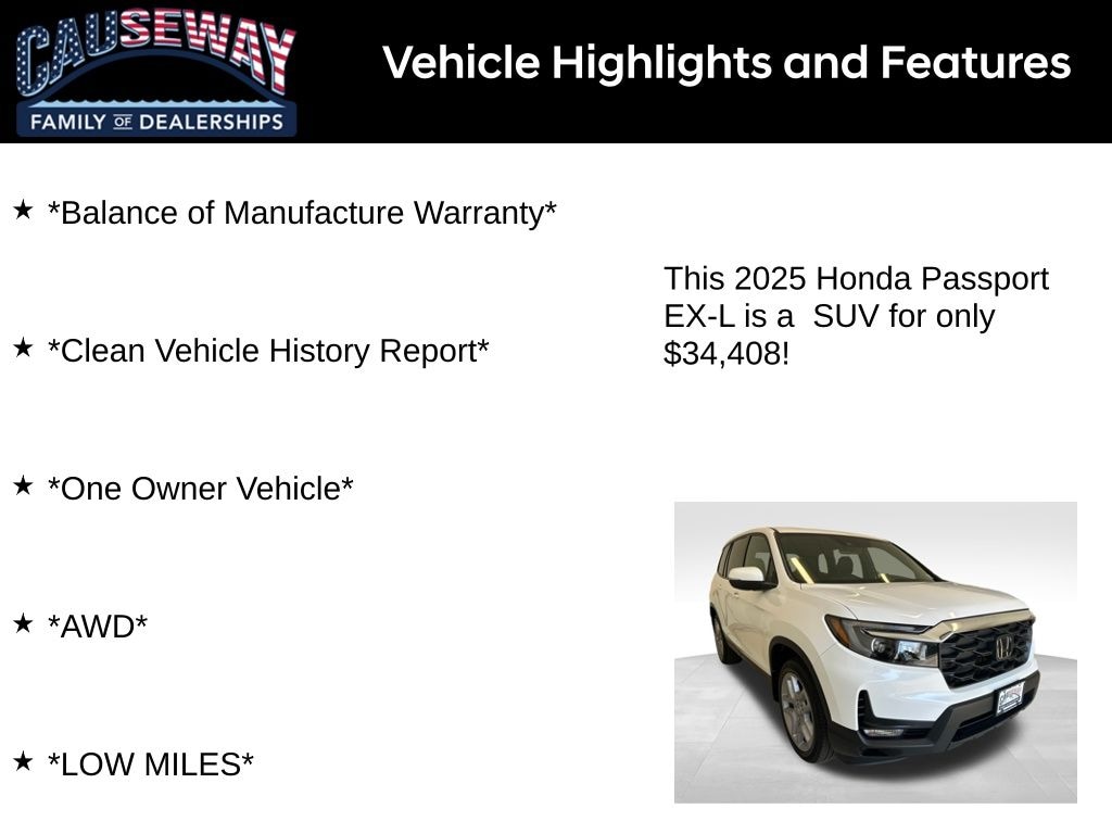 With low mileage, AWD capability, and EX-L luxury features, this 2025 Honda Passport is engineered to take you on every adventure in comfort, confidence, and style.