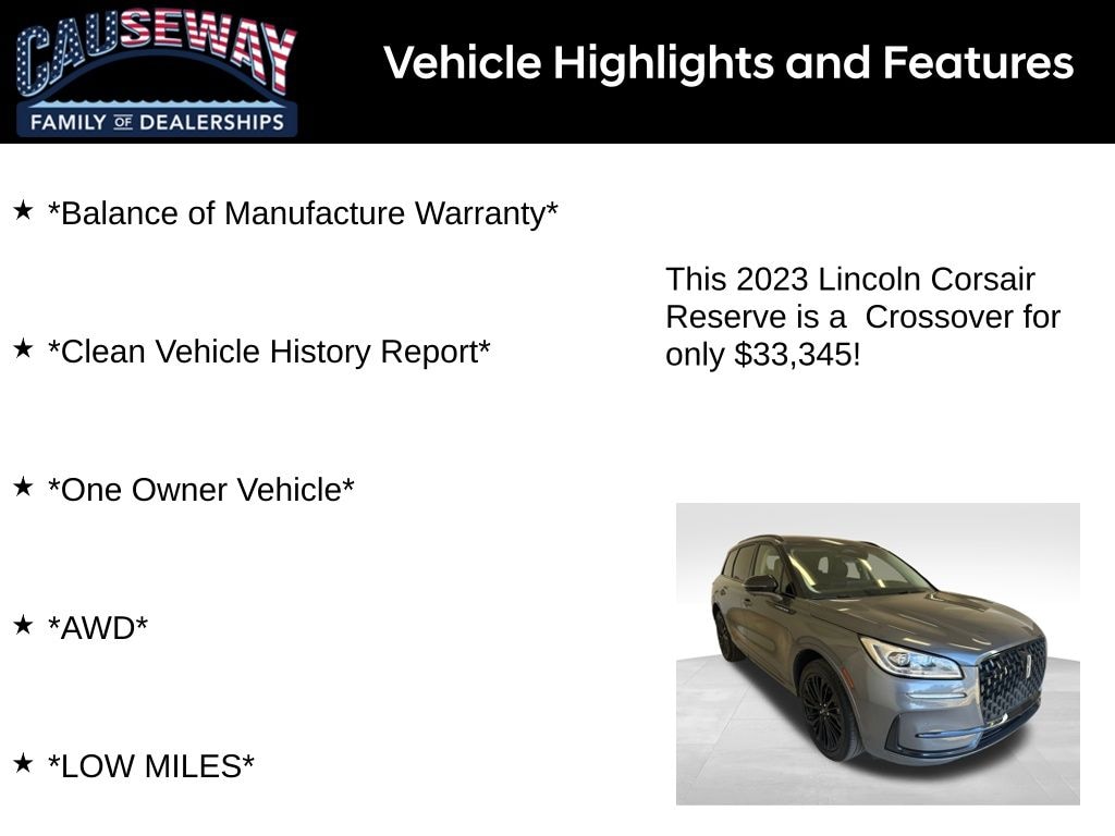 This 2023 Lincoln Corsair Reserve offers luxury, performance, and confidence in one sophisticated SUV. With low miles, one-owner history, and AWD capability, its ready to elevate your daily commute and weekend adventures with style, comfort, and peace of mind.