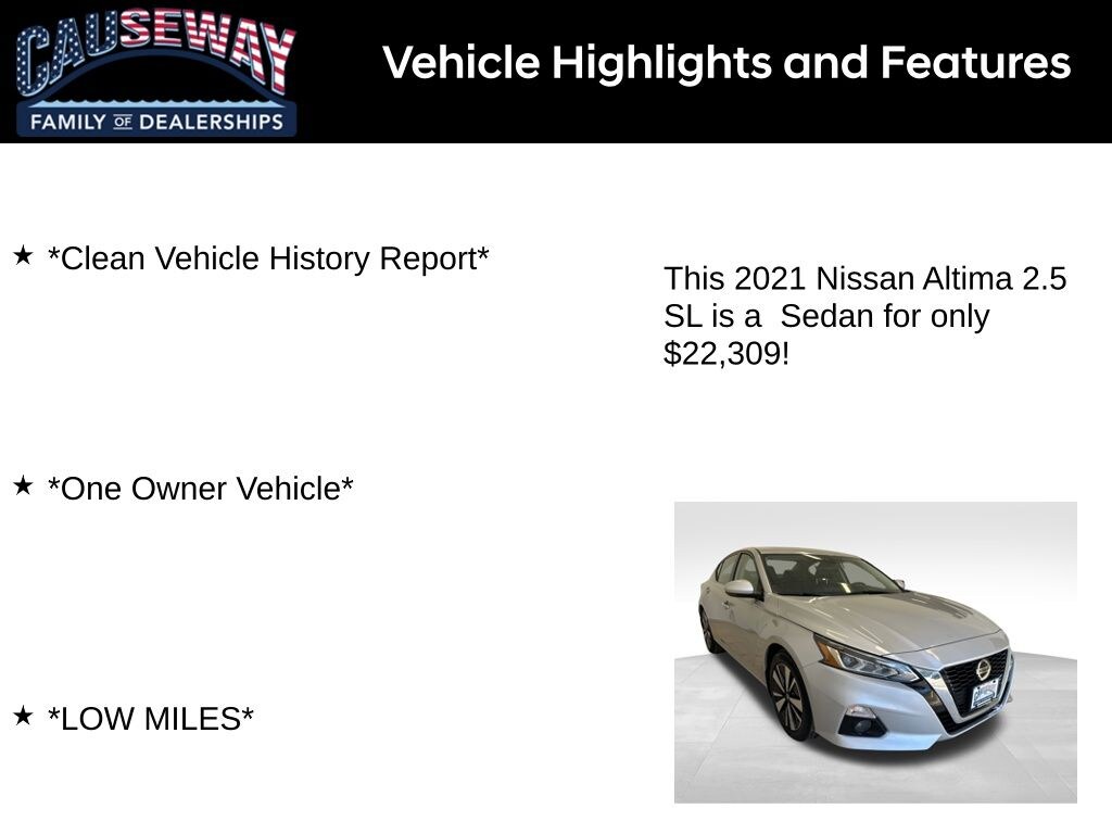 Experience the perfect blend of premium comfort, advanced technology, and outstanding fuel efficiency with this 2021 Nissan Altima 2.5 SL finished in sleek Brilliant Silver Metallic. This one-owner vehicle with a clean history report has been exceptionally well cared for and offers LOW MILES over 6,600 miles below market average, making it an outstanding value for drivers who want more for their money.