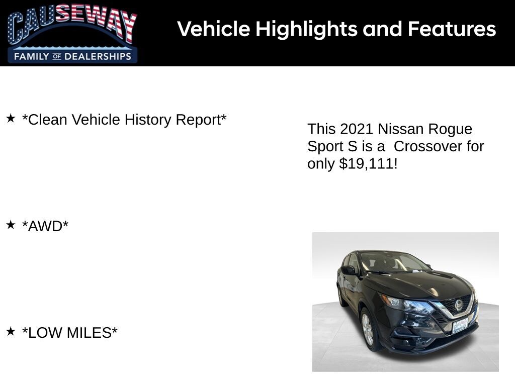 2021 Nissan Rogue Sport S Magnetic Black Pearl AWD CVT with Xtronic 2.0L DOHC *Clean Vehicle History Report*, *AWD*, *LOW MILES*.