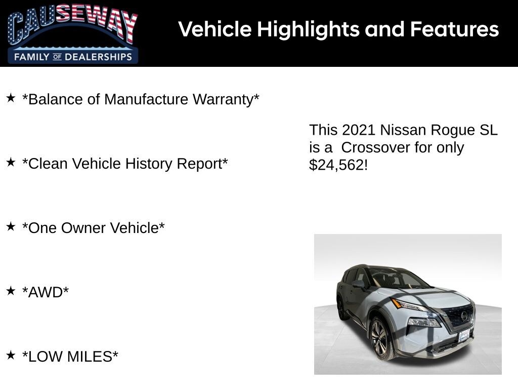 The 2021 Nissan Rogue SL AWD blends premium comfort, innovative technology, and award-winning Nissan safety into a stylish SUV thats ready for every drive.