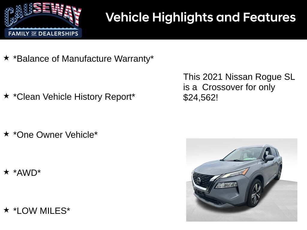 Elevate your driving experience with this 2021 Nissan Rogue SL AWD, finished in sleek Boulder Gray Pearl with a luxurious Charcoal Leather interior. This one-owner SUV comes with a clean vehicle history report, Balance of Manufacture Warranty, and low miles, ensuring lasting value and peace of mind. With only 45,115 miles1,926 miles below market averagethis Rogue SL stands out as a smart choice for drivers seeking refinement and reliability.