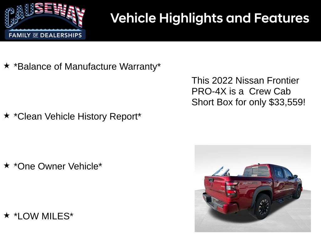 This 2022 Nissan Frontier PRO-4X in stunning Cardinal Red Tricoat is the ultimate midsize off-road truckpowerful, rugged, and packed with modern tech. With a Clean Vehicle History Report, One Owner status, LOW MILES, and remaining Manufacturer Warranty, this PRO-4X is the real deal for adventure seekers.