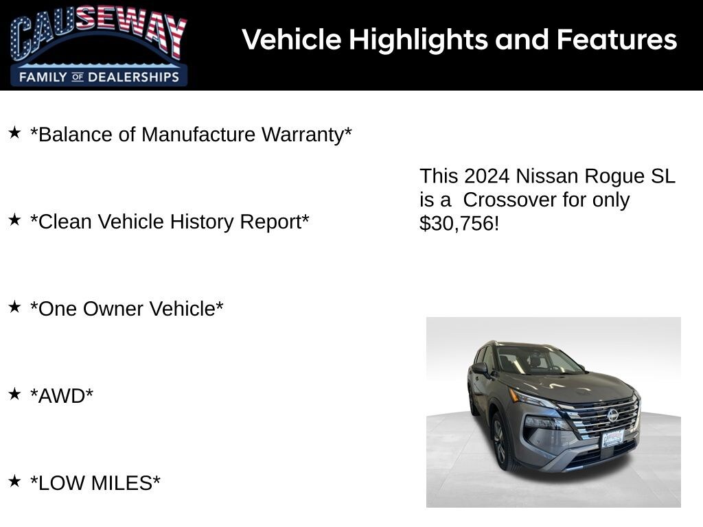 2024 Nissan Rogue SL Gun Metallic AWD CVT with Xtronic 1.5L DOHC *Balance of Manufacture Warranty*, *Clean Vehicle History Report*, *One Owner Vehicle*, *AWD*, *LOW MILES*, AWD.