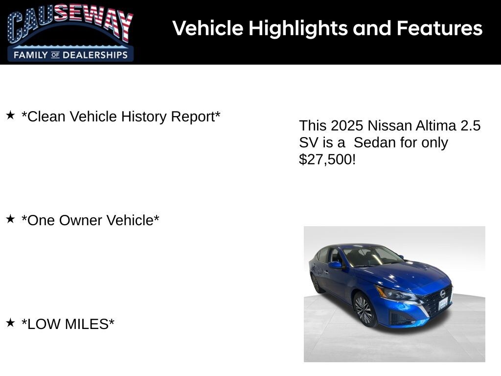 This 2025 Altima 2.5 SV delivers the rare combination of luxury-inspired comfort, leading-edge technology, and outstanding efficiency, all wrapped in a bold design. With a clean vehicle history report, one-owner status, and ultra-low miles, its a sedan you can count on for years to come.