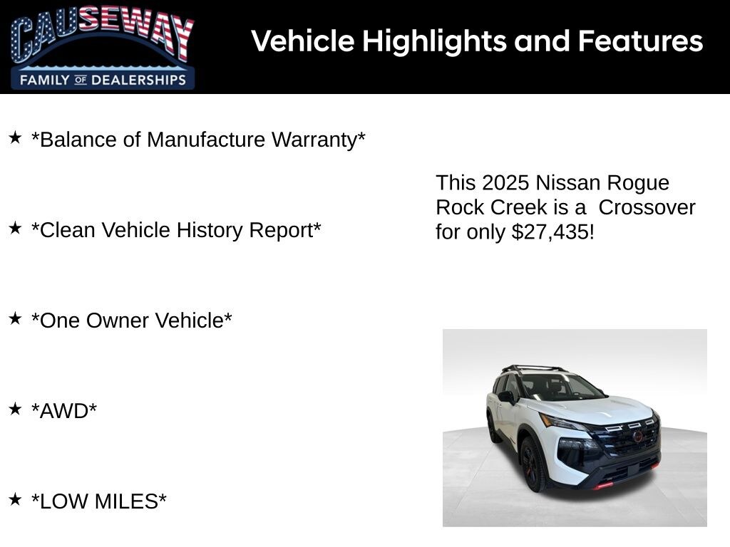 2025 Nissan Rogue Rock Creek Everest White Pearl AWD CVT with Xtronic 1.5L DOHC *Balance of Manufacture Warranty*, *Clean Vehicle History Report*, *One Owner Vehicle*, *AWD*, *LOW MILES*, AWD.