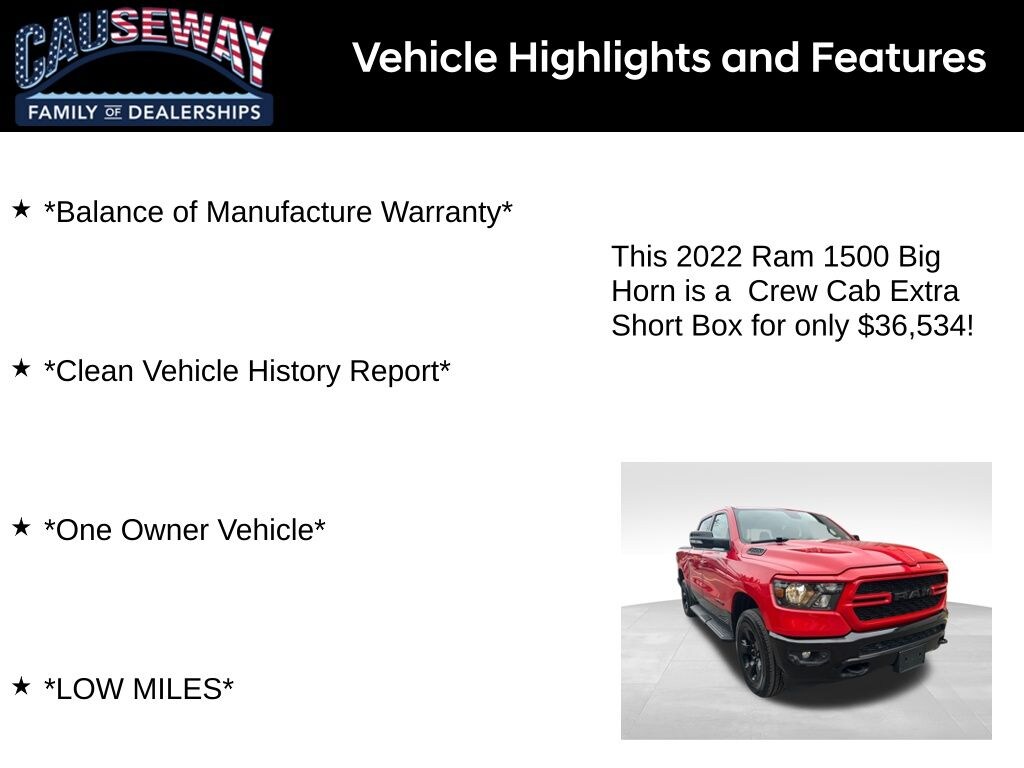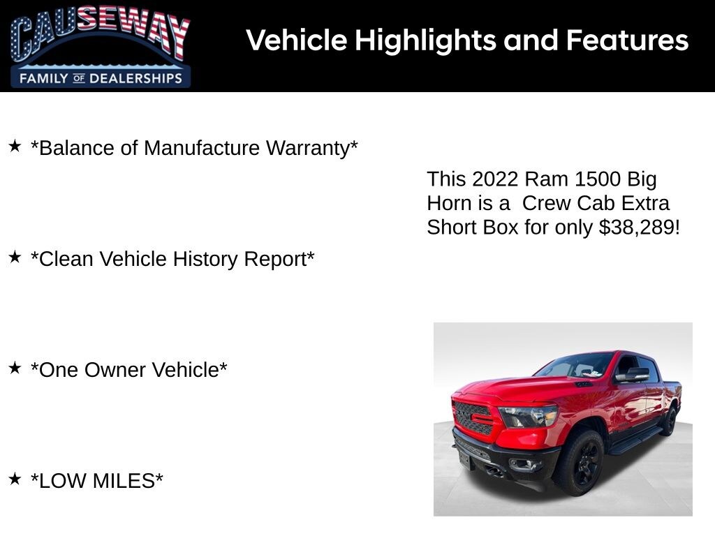 Turn heads and take on any job with confidence in this 2022 Ram 1500 Big Horn/Lone Star, finished in bold Flame Red Clearcoat and powered by the legendary 5.7L HEMI V8. With LOW MILES, one-owner history, and remaining factory warranty, this truck delivers the perfect combination of muscle, comfort, and modern tech.