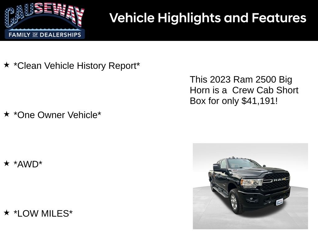 2023 Ram 2500 Big Horn Diamond Black Crystal Pearlcoat 4WD 8-Speed Automatic 6.4L V8 *Clean Vehicle History Report*, *One Owner Vehicle*, *AWD*, *LOW MILES*.