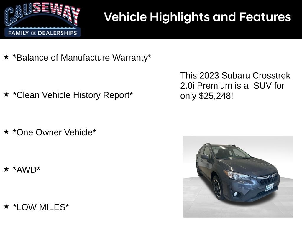 Adventure meets everyday comfort in this Magnetite Gray Metallic 2023 Subaru Crosstrek Premium. With only 14,338 milesover 10,000 miles below market averagethis one-owner, clean history AWD SUV is ready for wherever life takes you. Backed by the balance of the manufacturers warranty, youll drive with confidence and peace of mind.